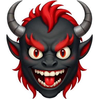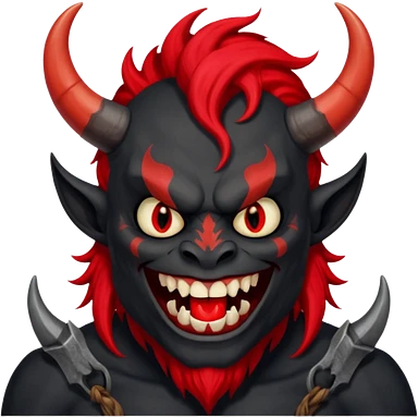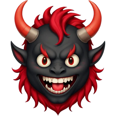 демон с чёрной как уголь кожей, красными клыками, двумя красными рогами торчащими у него изо лба, красной гривой и глазами смеётся (рядом текст "Ха-Ха") emoji
