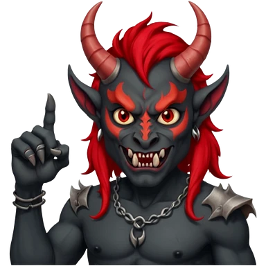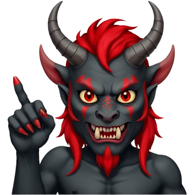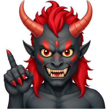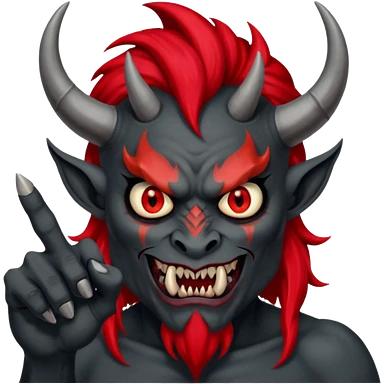 демон с чёрной как уголь кожей, красными клыками, двумя красными рогами торчащими у него изо лба, красной гривой и глазами показывает пальцем в нас emoji