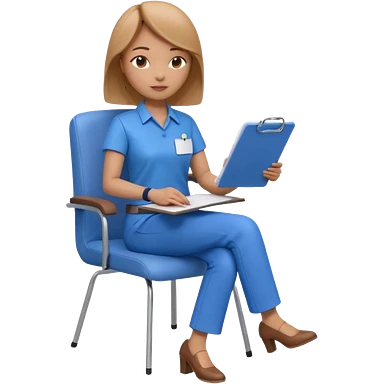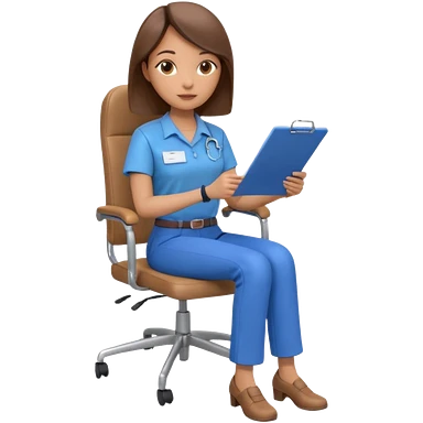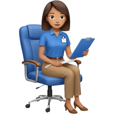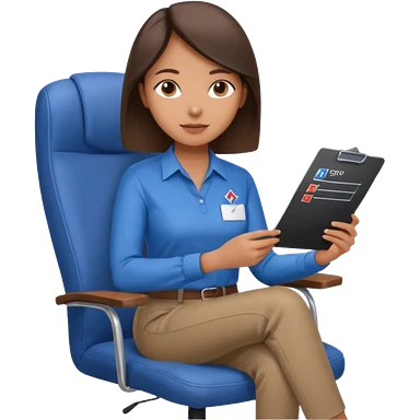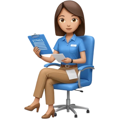 Generate an emoji of a female AI ethicist in blue shirt brown pant sitting in a chair and has a checklist stating AI ethics elements like stop bias, fairness score. I want 3d figurine emoji