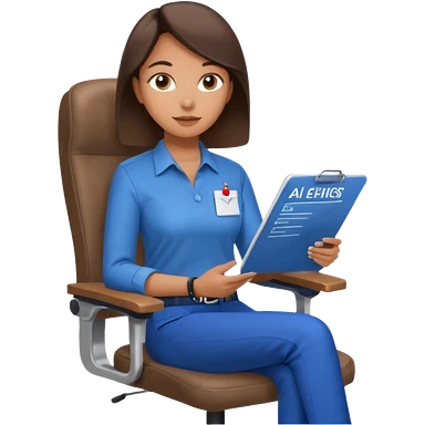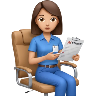 Generate an emoji of a female AI ethicist in blue shirt brown pant sitting in a chair and has a checklist stating AI ethics elements like stop bias, fairness score emoji