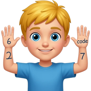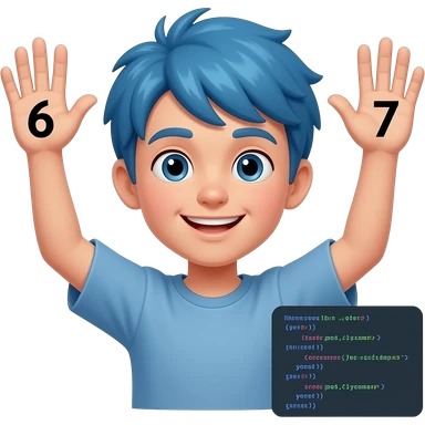 Decak sa plavom kosom sa podignutim rukamo pored glavd i brojevi na jedni ruku broj 6 a na drugu 7 i pored da pise kod emoji