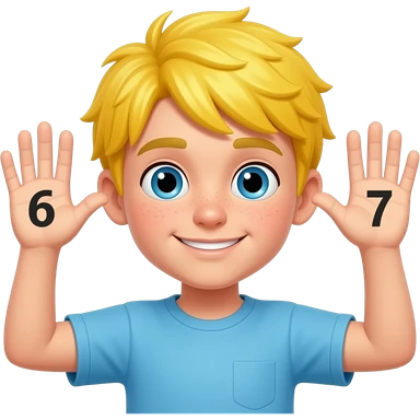 Decak sa zutom kosom sa podignutim rukamo pored glavd i brojevi na jedni ruku broj 6 a na drugu 7 i pored da pise emoji