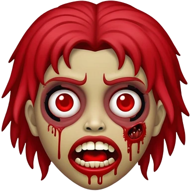 Um memoji de uma garota zombie com uma franja partinha de cabelo meramente vermelho e um pouco de sangue no rosto emoji
