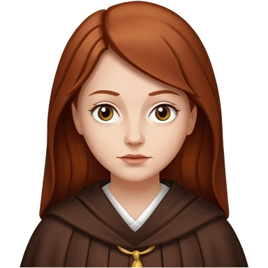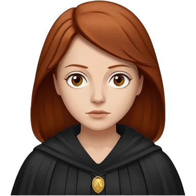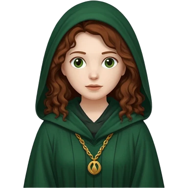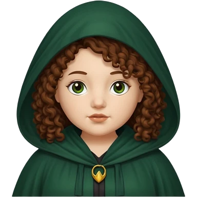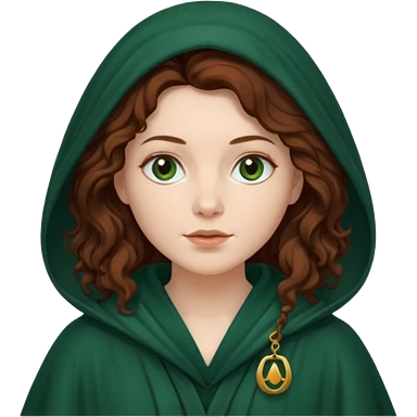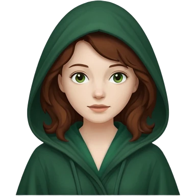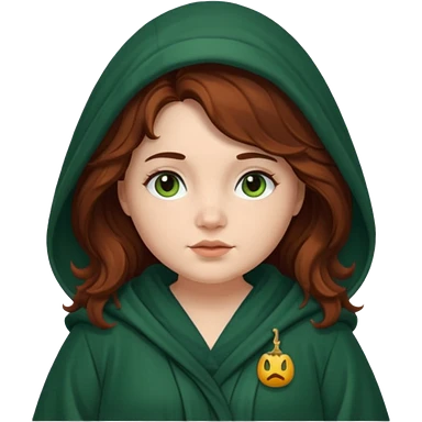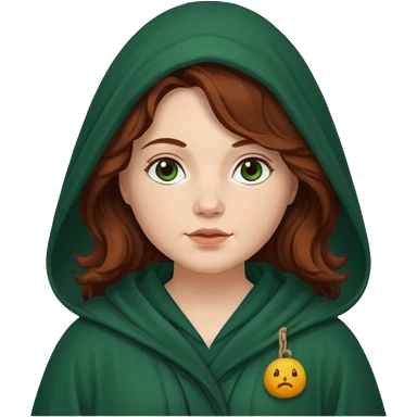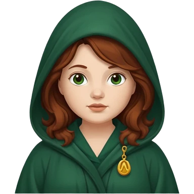 A white woman, a little heavier face, with long dark auburn hair robed and hooded like she's a Traitor in the tv show The Traitors. her hair is slightly curly, but kinda frizzy, not with defined curls, and the robe is a very dark green color emoji
