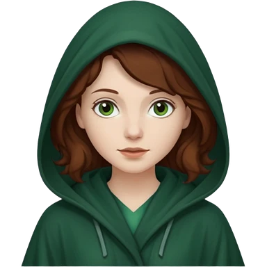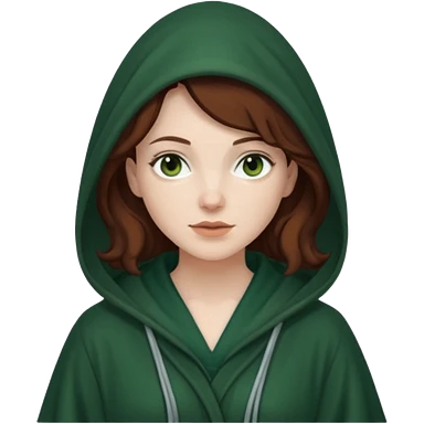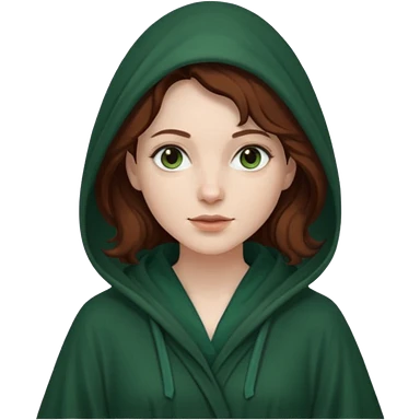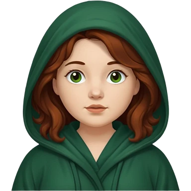 A white woman with a chubby face, with long dark auburn hair robed and hooded like she's a Traitor in the tv show The Traitors. her hair is slightly curly, but kinda frizzy, not with defined curls, and the robe is a very dark green color emoji
