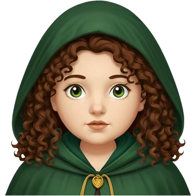 A white woman, a little thicker, with long dark auburn hair robed and hooded like she's a Traitor in the tv show The Traitors. her hair is mostly curly (kinda frizzy, not clean curls) and the robe is a dark dark forest green green emoji