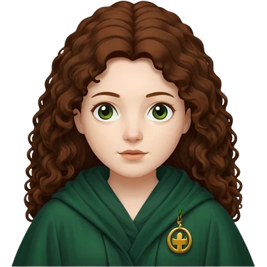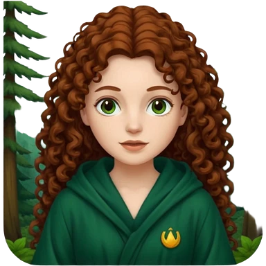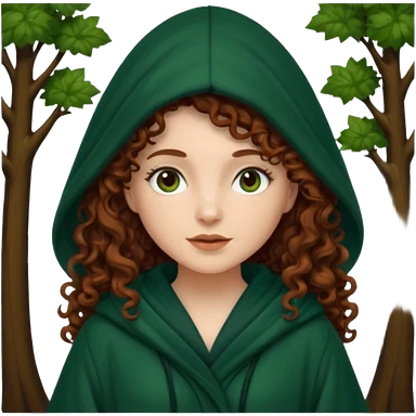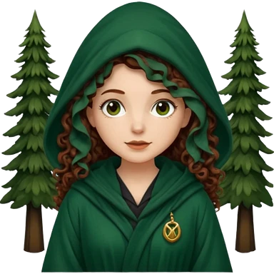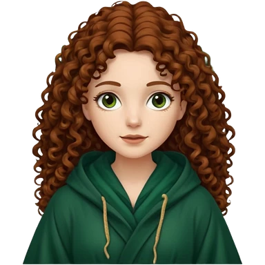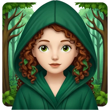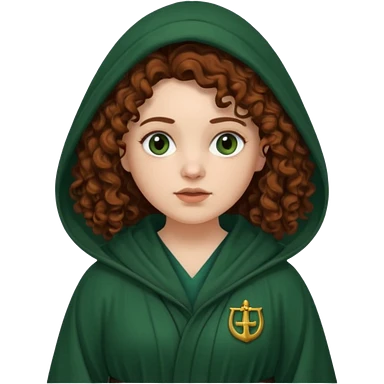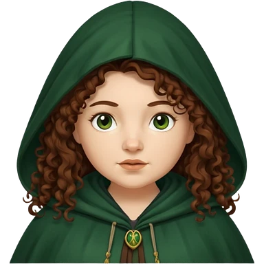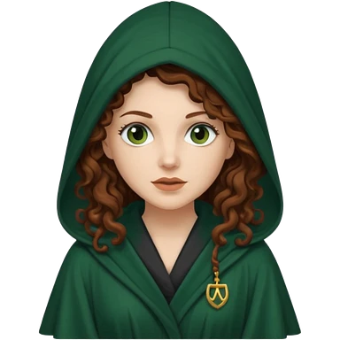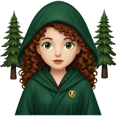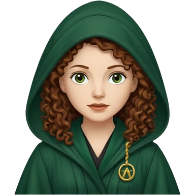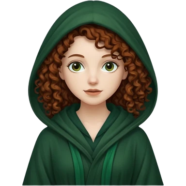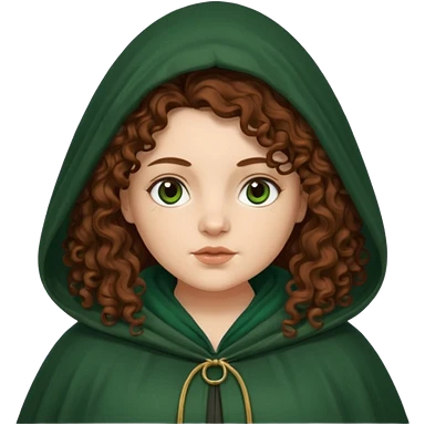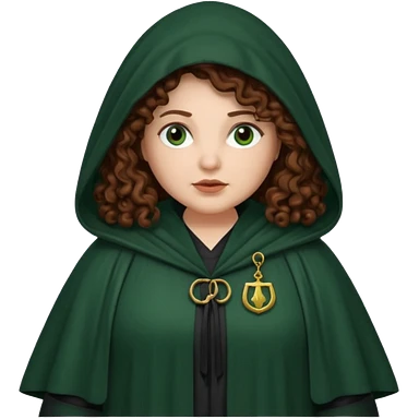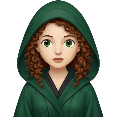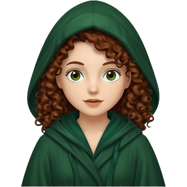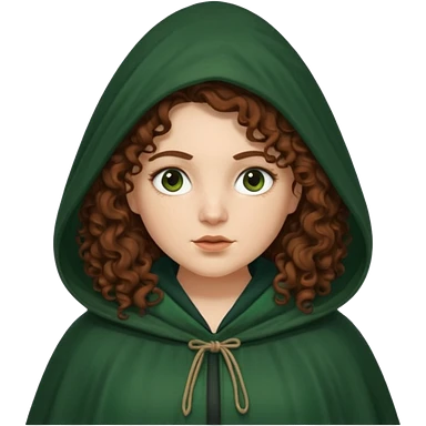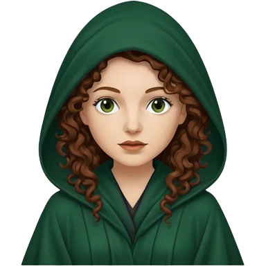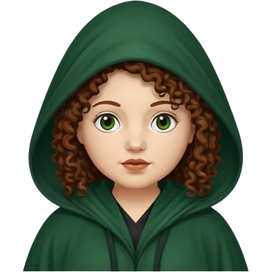 A white woman, a little thicker, with long dark auburn hair robed and hooded like she's a Traitor in the tv show The Traitors. her hair is mostly curly (kinda frizzy, not clean curls) and the robe is a dark dark forest green color emoji