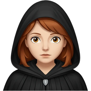 A white woman with a chubby face, with long dark auburn hair, cloaked and hooded like she's a Traitor in the tv show 'The Traitors'. her hair is frizzy curly, not with defined curls, and the robe is a very dark green/almost black color emoji