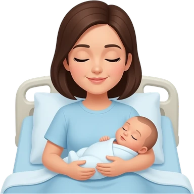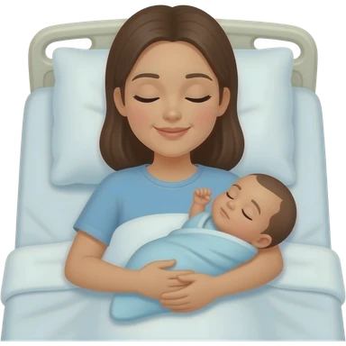 A mother on hospital bed with newborn baby boy with the baby's eyes closed and no hair emoji