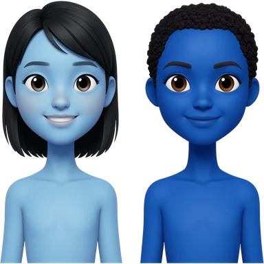 Ganzkörperportrait. Aktmalerei. Zwei weibliche Figuren am Anfang ihrer Zwanziger. Die eine Figur ist ostasiatisch und hat blaue Haut. Die andere Figur ist ostafrikanisch und hat blaue Haut. Keine Figur hat die Augen geschlossen. Die Stimmung ist sehr fröhlich aber auch chillig. emoji
