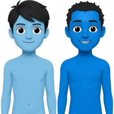 Ganzkörperportrait. Aktmalerei. Zwei Figuren am Anfang ihrer Zwanziger. Die eine Figur ist ostasiatisch und hat blaue Haut. Die andere Figur ist ostafrikanisch und hat blaue Haut. Keine Figur hat die Augen geschlossen. Die Stimmung ist sehr fröhlich aber auch chillig. emoji