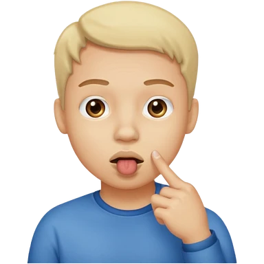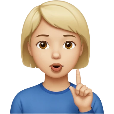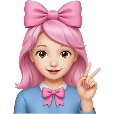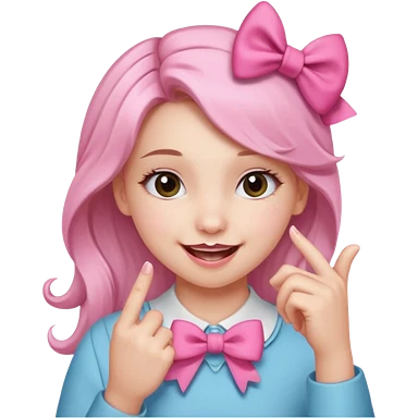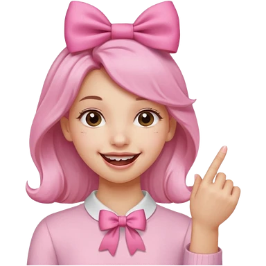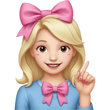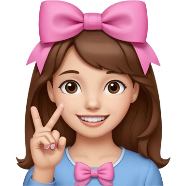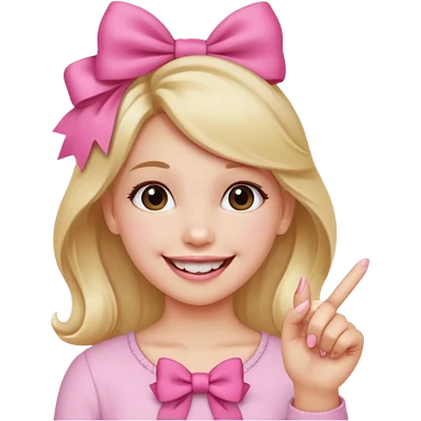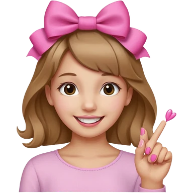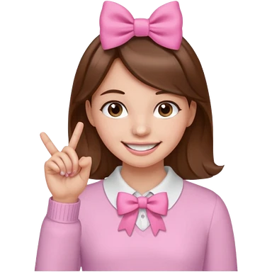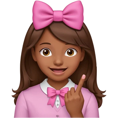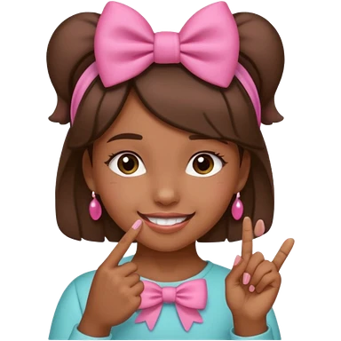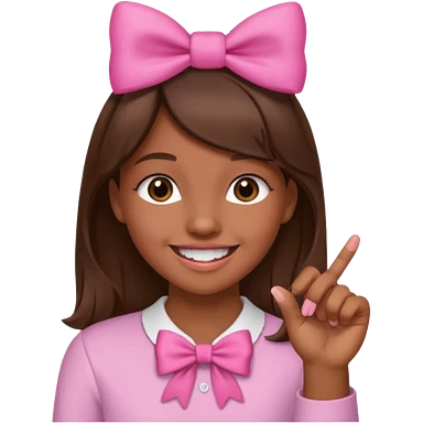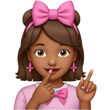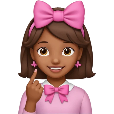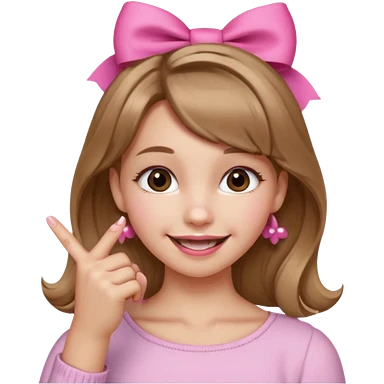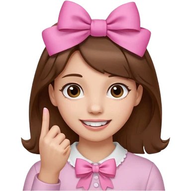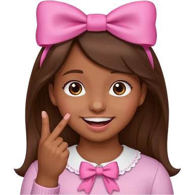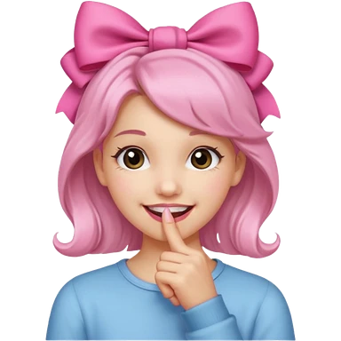 Chica con pelo marron sonriendo con un lazo rosa en la cabeza y con la punta del dedo indice entre los dientes con delicadeza y la otra mano que no salga en el emoji emoji