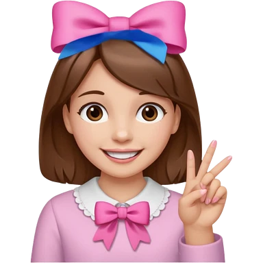 Chica con pelo marron sonriendo con un lazo rosa en la cabeza y mordiendose la punta del dedo indice con delicadeza y la otra mano que no salga en el emoji emoji