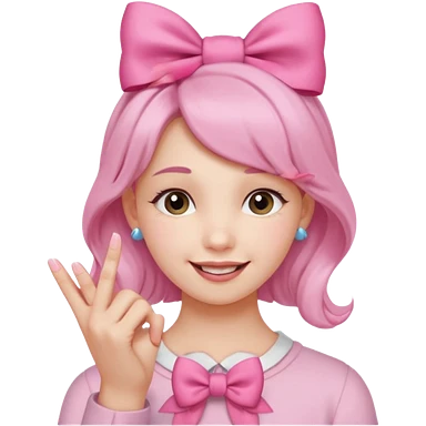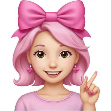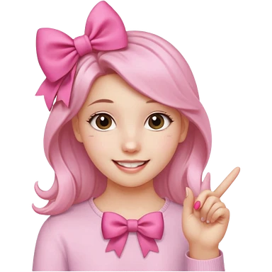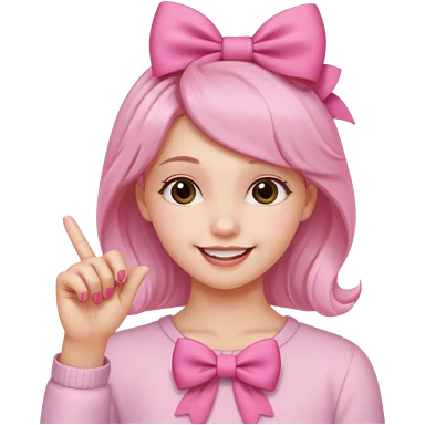 Chica sonriendo con un lazo rosa en la cabeza y mordiendose la punta del dedo indice con delicadeza y la otra mano que no salga emoji