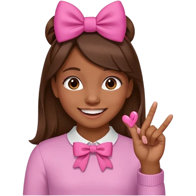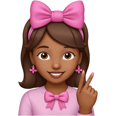 Chica morena sonriendo con un lazo rosa en la cabeza y mordiendose la punta del dedo indice con delicadeza emoji