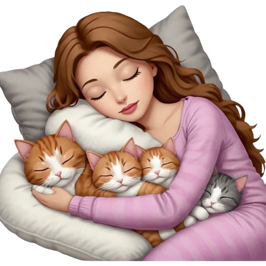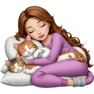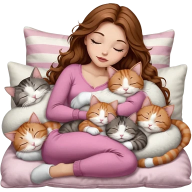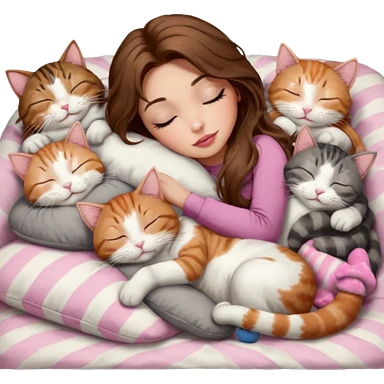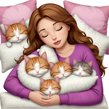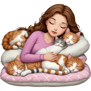 girl with long wavy brown hair, brown eyes, long lashes makeup, sexy pink lips, light to medium complexion, sleeping on a cozy pillow, with 6 cats: 1 brown and white tabby cat, 1 ginger and white, 2 grey and white, 1 grey has white mittens and small white patch on its chest and 1 calico, sleeping emoji