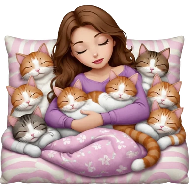 girl with long wavy brown hair, brown eyes, long lashes makeup, sexy pink lips, light to medium complexion, sleeping on a cozy pillow, with 6 cats: 1 brown and white tabby cat, 1 ginger and white, 2 grey and white, 1 grey with white mittens and small white patch on chest and 1 calico, sleeping emoji