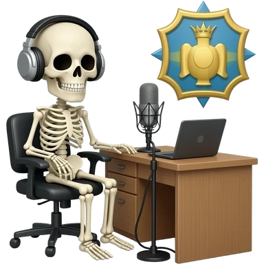 He don’t care skeleton with headphones and a desk Mike doing a podcast with this emblem behind him emoji