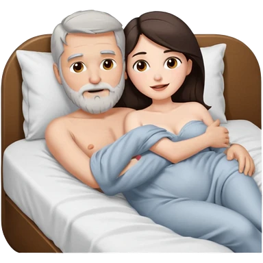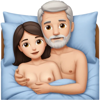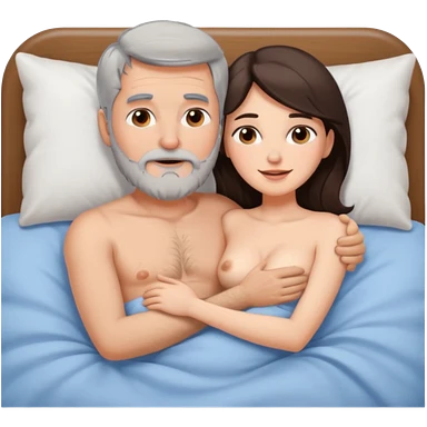 Grey haired bearded man , and pretty brunette woman naked spooning in bed emoji