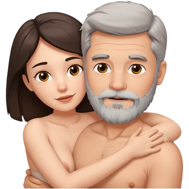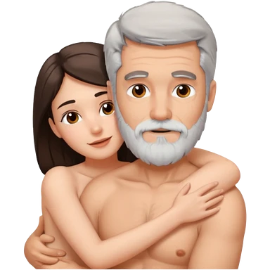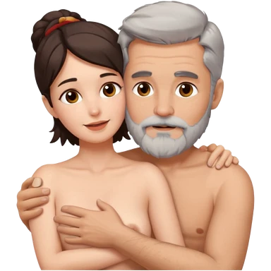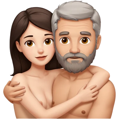 Grey haired bearded man, and pretty brunette woman cuddling naked emoji