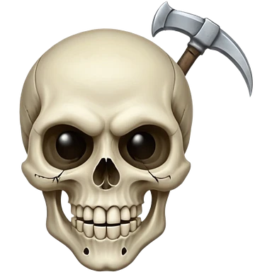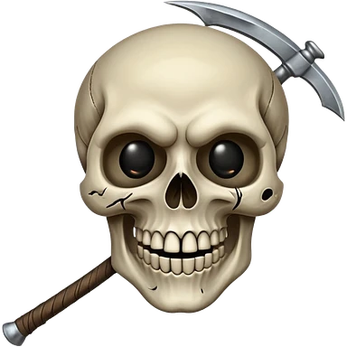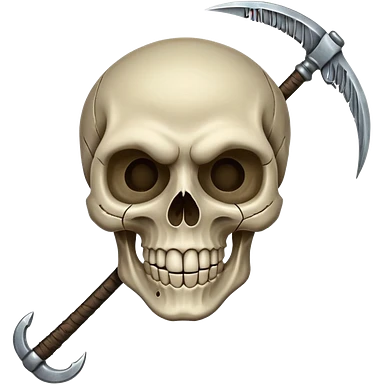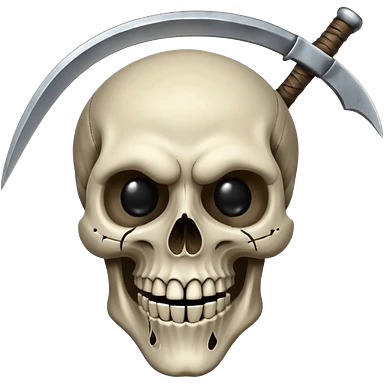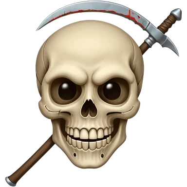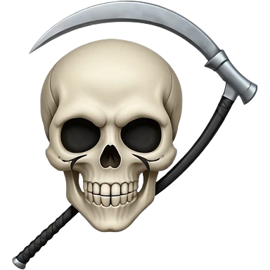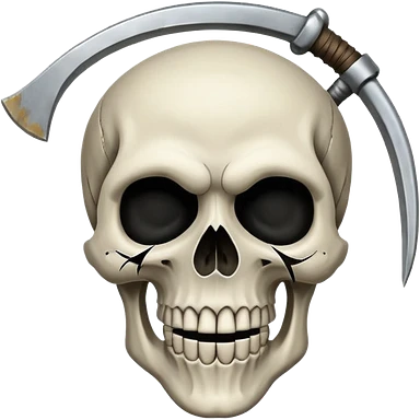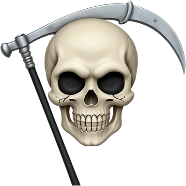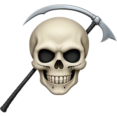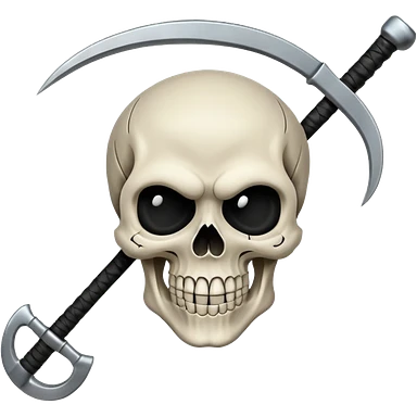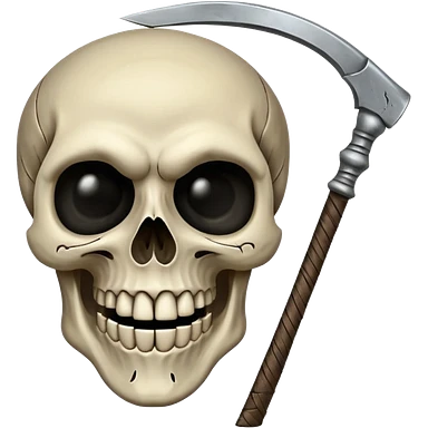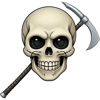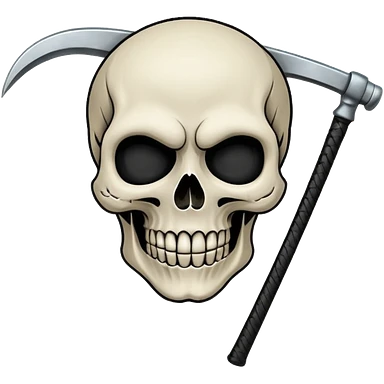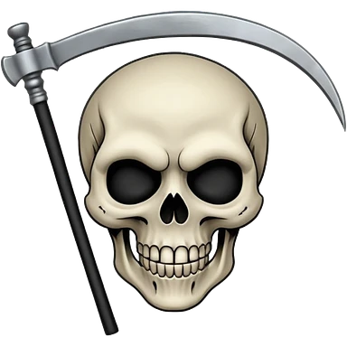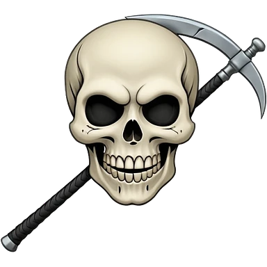 A laughing skull with a scythe crossed behind it, one eye socket winking. Clean, stylized lines, flat vector. Medieval woodcut style. Black and white with one accent color (tarnished silver). No background. emoji