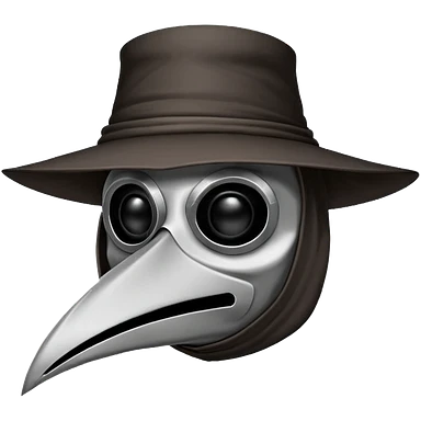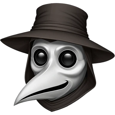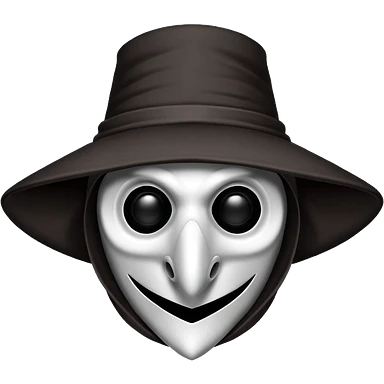 Morbid medieval plague doctor mask with a wide, sinister smile, visible in the empty eye sockets a tiny glow. Clean, stylized lines, flat vector illustration suitable for a small emote. Stylized as a medieval woodcut or metal engraving. Black and white with one accent color emoji