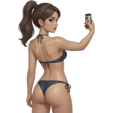 girl wearing only a thong, taking selfie, back facing viewer full body, hot, sexy, pale skin , realistic proportions, oiled up, glistening skin emoji