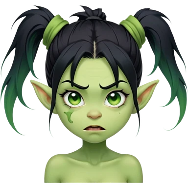 a cute green skinned goblin girl with black hair in a messy high ponytail making a lewd expression emoji