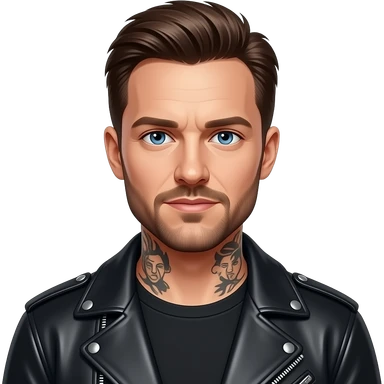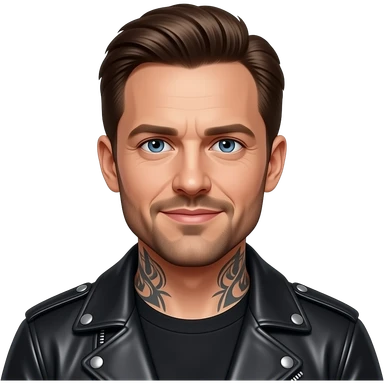Sebastian Stan with tattoos and a leather jacket and one metal arm emoji