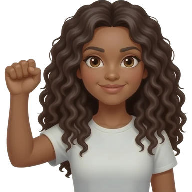 A brown woman with dark long curly hair and big pouting lips Holding her hand up with closed fist emoji