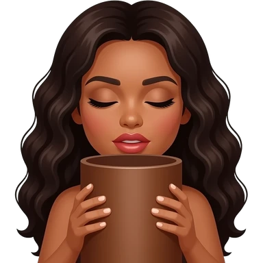 A brown woman with dark long curly hair and big lips sucking on a big brown cylinder emoji