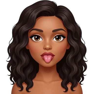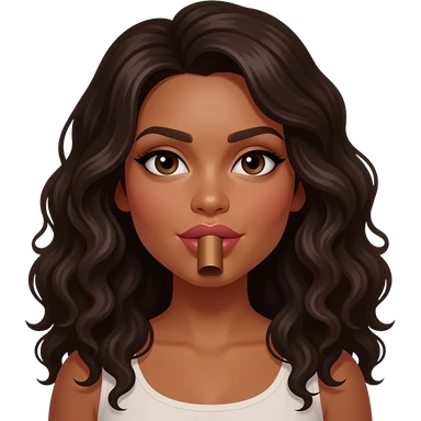 A brown woman with dark long curly hair and big lips sucking on a brown cylinder emoji