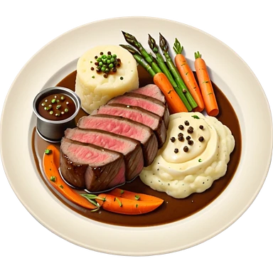 Medium rare Wagyu steak on a bed of creamy garlic mash potatoes couples with pan seared carrots and apparus and a lovely black pepper truffle sause emoji