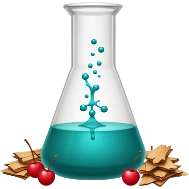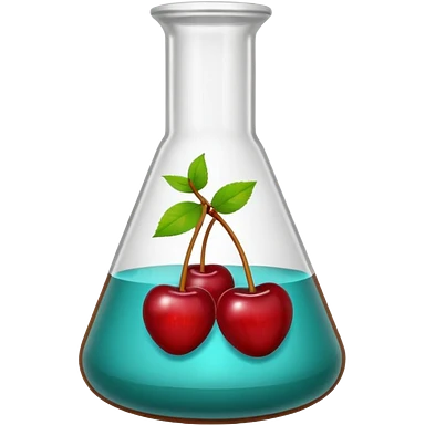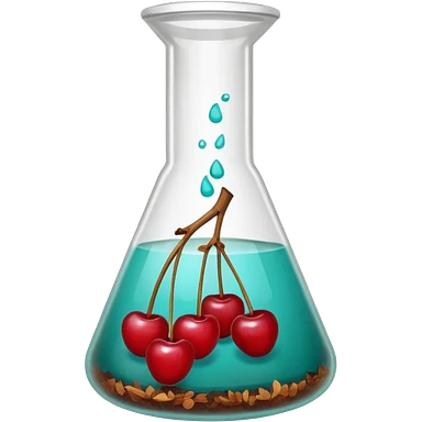 A science beaker filled with teal chemical, cherries, and wood chips emoji