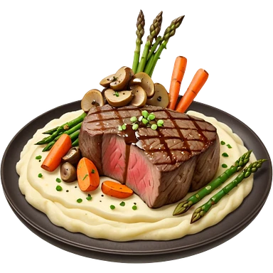 Medium rare Wagyu steak on a bed of creamy garlic mashed-potatoes, coupled with pan seared carrots mushrooms asparagus and a lovely black pepper truffle sause emoji