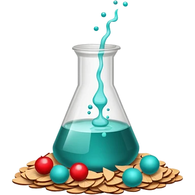 A science beaker filled with teal chemical, cherry slices, paper balls, and wood chips emoji