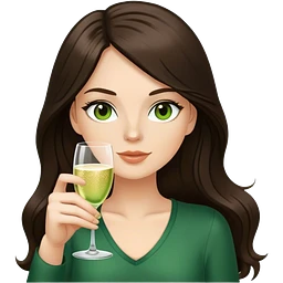 White girl with long dark brown hair and brown eyes and a green top and brown eyes with glass of champagne emoji