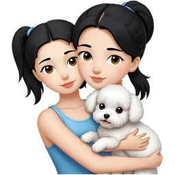 One girl with straight hair in a ponytail,hugging one Bichon frise emoji