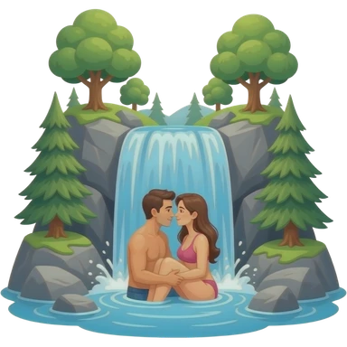 Waterfall with rocks and trees and a couple having sex underneath emoji