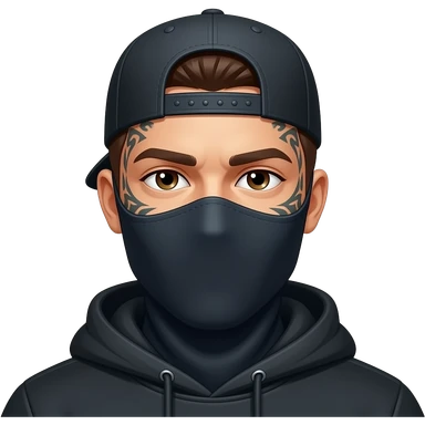 Una emoji que tenga en la cara tatuajes y un pasamontañas y una cachucha hacia atrás emoji