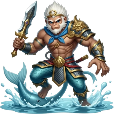 Matchanu, half monkey half fish (hybrid creature), white fur like Hanuman with a fish tail, swimming in deep sea, holding a weapon, powerful dynamic pose, marine atmosphere. emoji