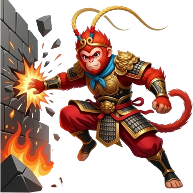 Sukrip, the red monkey king, fierce and powerful, smashing a giant wall, dynamic pose, fire-colored fur, traditional warrior attire, destruction effect background. emoji