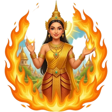 Nang Sida, the virtuous queen, pure face, standing gracefully amidst purifying fire, light radiating from body, intricate golden traditional costume, resetting effect aura, mythical palace background. emoji