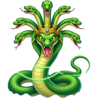 Ananta Shesha, the divine serpent king with multiple heads, coils binding enemies, glowing green and gold scales, magical binding effect, ocean background, card game style. emoji