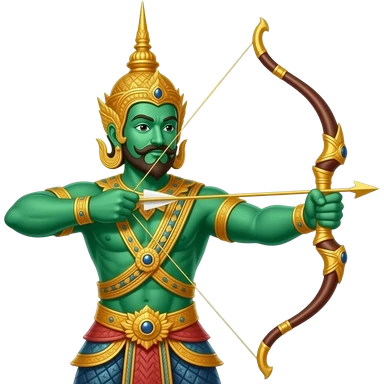 Phra Ram, the divine King with emerald green skin, aura of glowing gold, holding a celestial bow, majestic expression, royal Thai traditional crown and armor, serene yet powerful, sacred light emanating. emoji