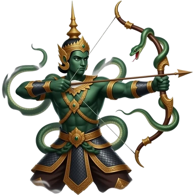 (งู), ปิดทางเดิน Indrajit, the powerful demon prince, dark green skin, shooting an arrow that turns into snakes, coils of snakes binding enemies, royal traditional Thai armor, dark magic aura. emoji