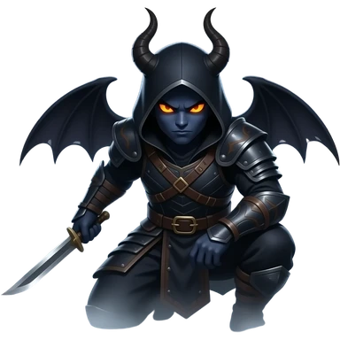 Virunjambang, the stealthy demon warrior, dark skin, blending into a thick fog, holding a dagger, glowing eyes, assassin-style pose, blurred night background. emoji