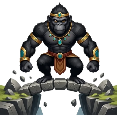 Nila Pat, the dark charcoal monkey warrior, intense expression, creating a bridge of rocks, heavy build, black fur, gold and stone jewelry, dynamic rock background. emoji
