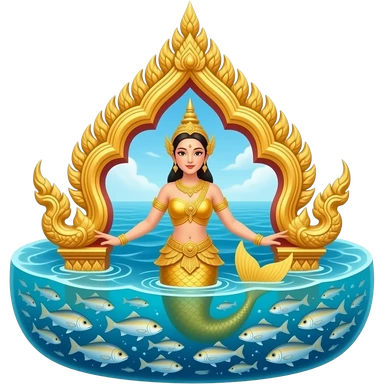 Suvannamaccha, the beautiful golden mermaid, leading a shoal of fish, creating a barrier, intricate traditional Thai ornaments, ocean background, card game style. emoji