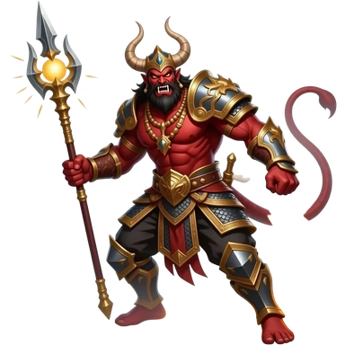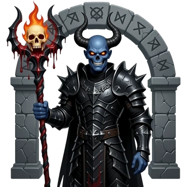 Sattasur, the grim demon gatekeeper, holding a soul-snatching staff, dark blue skin, eyes like burning skulls, intricate but dark armor, ominous entrance background. emoji
